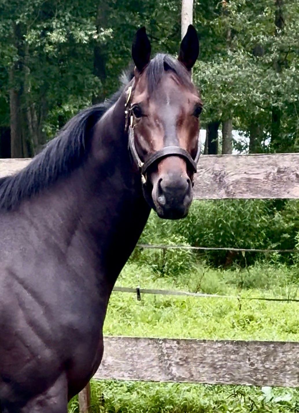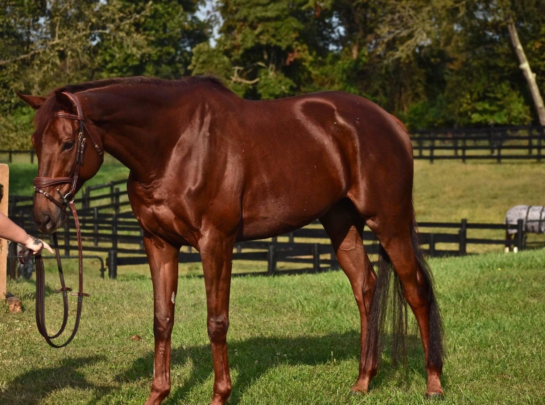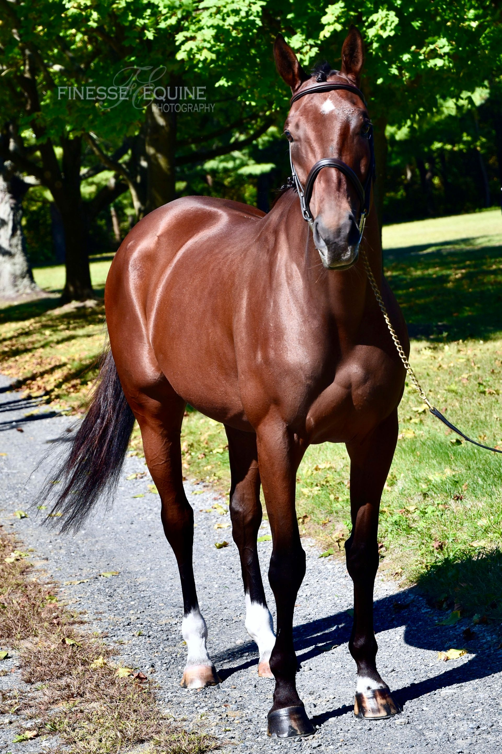 Dawn is a lovely 16.1h big bodied 2019 American Pharaoh mare. After 4 starts she retired sound without injuries or ailments. She spent the winter turned out and has been in retraining for two months. She is currently WTC and jumping crossrails. She is a nice quiet type that is happy to try anything asked of her. Located in NJ. High fours to low five video below