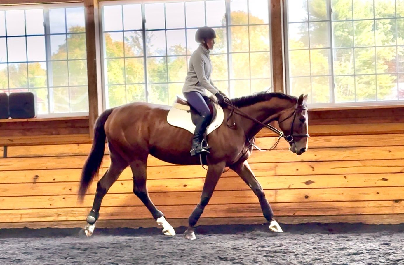 Lukas is super handsome 16.1h gelding with 6 starts retired from racing sound without any injuries or ailments. I acquired him in June 2024 and has been in consistent proper retraining for 1 year and 4 months. He is currently cantering small courses with fillers and starting his lead changes. He has jumped up to 3'3. On the flat Lukas is well broke to all the basic dressage movements. He is fun to ride and always aiming to please. He has the sweetest, most kissable personality. He has schooled off property. Big, sporty mover.