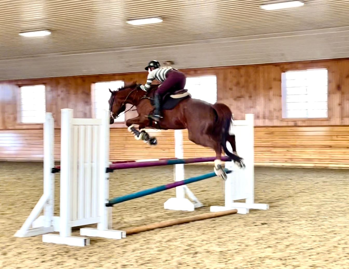 This liver chestnut mare has excellent technique for jumping. She exhibits lightness on her feet and willing attitude for showjumping.